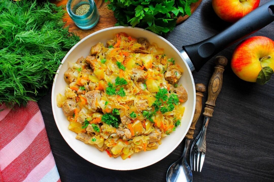 Нам понадобиться: Пошаговое приготовление ШАГ 1: Как потушить мясо с капустой и яблоками? Подготовьте все необходимые продукты, которые указаны. Для рецепта я взяла кусок свиной шеи, она в меру жирная и сочная. Использовать можно любую часть животного, в процессе приготовления мясо станет мягким. Если вы хотите более лёгкий вариант блюда, то возьмите курицу или грудку.