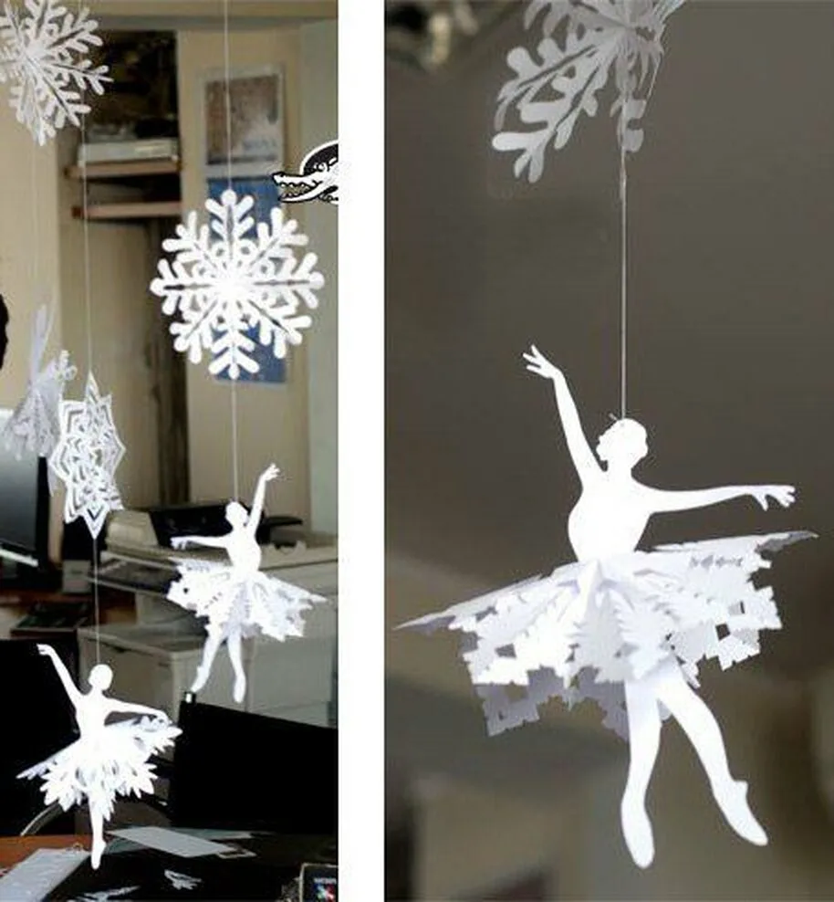 Всем доброго времени суток! Очень изящно и нарядно смотрится вот такая интересная и воздушная гирлянда из бумаги. В основе такой гирлянды балерина в пышной пачке. Выглядит достаточно красиво и оригинально, а вот делать очень просто. Нужно всего лишь вырезать нужное количество балерин из бумаги по шаблону, затем вырезать снежинки из бумаги и нарядить этой самой снежинкой балерину. Все просто. Балерин подвесить на ниточке на основную нить, которая будет натягиваться, например, между колоннами, в углу или еще где-нибудь. Гирлянда получится легкая, воздушная, но при этом объемная и очень интересно смотрится. Итак, балерины в пышной и ажурной пачке. Вдохновляйтесь! Дополнительно гирлянду можно декорировать просто снежинками. Будет очень красиво! Шаблоны для вырезания основы, балерины. Вот такие замечательные балерины получатся из шаблона и снежинки. А еще, вот так, можно декорировать балерин, цветочками, бабочками.