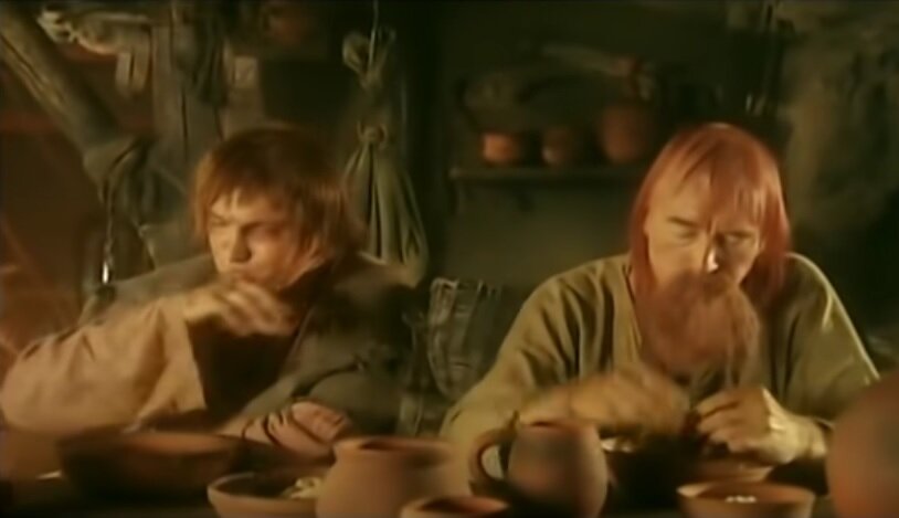 А тут ещё народу прибыло. Сначала пришел розоволосый мужик с другом, потом грибы Мораны с колдуном заглянули. Розоволосому гримеры не смогли подобрать совпадающую по цвету бороду, поэтому он выглядит, как герой аниме.