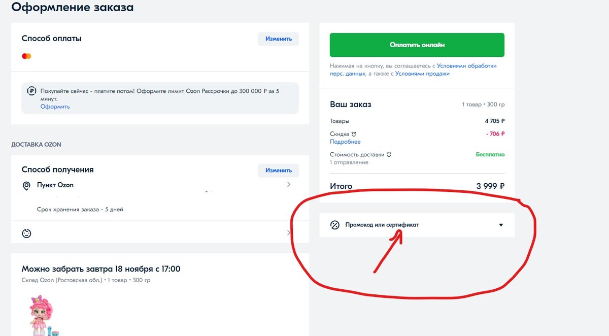 3. В окне "Промокод или сертификат" введите OZON1345GP