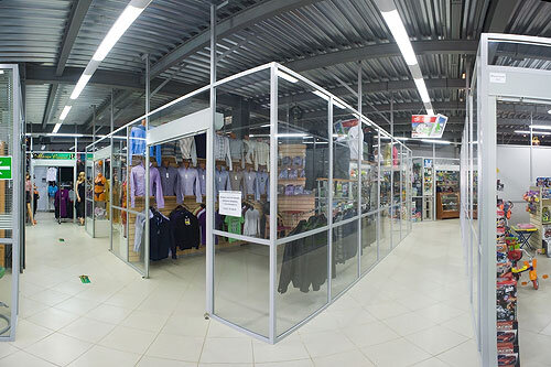 Использование перегородок из алюминиевого профиля позволило обеспечить отличный обзор товаров, представленных в торговых павильонах, и максимально зрительно расширить помещения ТЦ. Каркас перегородок стал удобной основой для навесного торгового оборудования. В этом проекте использованы торговых перегородок в экономичной комплектации, их толщина составляет всего 40 мм. Это позволило уменьшить стоимость заказа, сохранить максимум полезной площади и добиться максимальной зрительной легкости конструкции. Несмотря на значительную высоту потолка (3,5 метра), нам удалось обеспечить высокую жесткость конструкции перегородок за счет использования специальных укосин. Как и во многих других торговых центрах, на входах в павильоны вместо дверей установлены рольставни. Алюминиевый каркас торговых перегородок обеспечивает им повышенную прочность и долговечность. А система перегородок из алюминиевого профиля QUASAR-LUX, кроме того, дает реальную возможность многократного демонтажа/повторного монтажа
