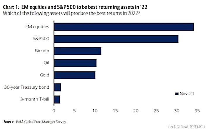 Согласно опросу Bank of America, проведенному с 5 по 11 ноября 2021 года, управляющие глобальными фондами считают, что акции развивающихся рынков и США обеспечат лучшую доходность в следующем году. Потом идут биткойн, нефть, золото. Опрос также выявил, что управляющие фондами сократили свои запасы кэша до 4,4% с 4,7% в октябре, поскольку инвесторы выкупили коррекцию. Bank of America опросил 345 участников с 1,1 триллионом долларов под управлением.⤵️ !!!Предупреждение!!! Это не сигнал для набора данных позиций!! Не следует вестись на хайповые новости, теории, опросы или мнение экспертов!! Это рынок! И он всегда не предсказуем!!! По этому думайте своей головой!! Если было полезно, то подписывайтесь на канал чтобы не пропустить самое интересное. Жми сюда ➡️ Финансовая Независимость.