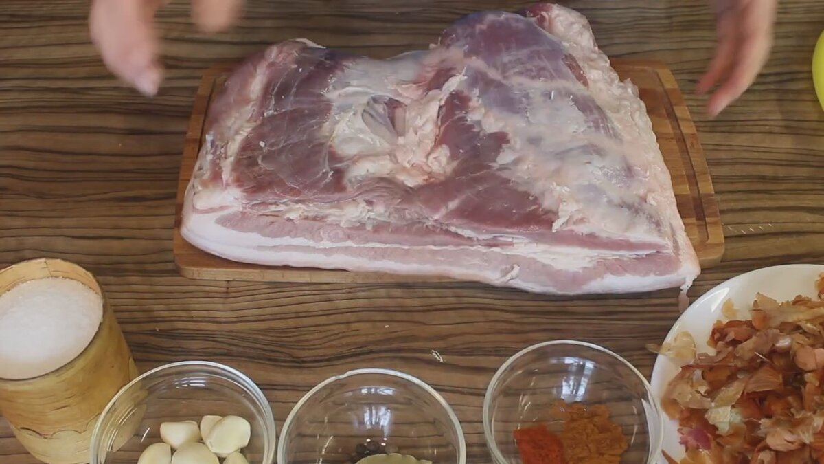 Вкусный рулет из свиной брюшины, вареный в луковой шелухе. В меру соленый с мягкой шкуркой, с ароматом чеснока и специй. Пошаговый рецепт. Для этого рецепта беру свиную брюшину весом 2кг. Выбираем с прослойками мяса. Обрезаю и обравниваю, чтобы кусок был ровнее . Подрезаю край шкурки до середины, чтобы после того как заверну брюшину , шкурка была сверху рулета. Подготовлю посолочную смесь которой буду натирать свинину. В мисочку кладу натёртую головку чеснока ,паприку, перец красный и черный молотый, соль. Все перемешиваю и этой смесью натираю брюшину. Заворачиваю в рулет. Перевязываю плотно жгутом. В таком виде отправляю варится в кастрюлю. Кладу чистую луковую шелуху снизу и сверху на рулет. Для красивого цвета и аппетитного вида. Добавляю соль, на 1 литр 150гр, лавровый лист и душистый перец для аромата. Заливаю водой чтобы покрыло рулет. Отправляю на горячею плиту, после закипания убавляю нагрев и варю 1.5 часа. Затем убираю с плиты и оставляю рулет в этом же рассоле остывать.