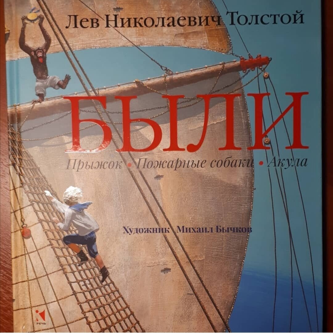 Одни из самых сильных рассказов Льва Николавича Толстого в оформлении Михаила Бычкова - сильнейшего художника-иллюстратора нашего времени. Небывалые "Были" в итоге получились. Захотелось показать их ребёнку именно такими. Захватывает. Погружает. Волнует. Волнует текст - всегда с трудом удерживаюсь от слёз в конце рассказа, читая "Прыжок". Толстой - мастер слова, несколькими предложениями ТАК передать боль мужчины за близкого человека, за ребёнка. Волнуют иллюстрации, они следуют за текстом, вторят ему, открывают новые стороны, делают объёмным. Читая и рассматривая книгу - истинно погружаешься, затихаешь, вглядываешься... Вглядываешься в акулу под водой, в чёрточки горных дорог, в переплетения корабельных канатов и детали лондонских улиц. Магия рисунка дополняет магию текста. Возможность показать ребёнку ТАКОГО Толстого - большая удача. "В это время капитан корабля, отец мальчика, вышел из каюты. Он нёс ружьё, чтобы стрелять чаек. Он увидал сына на мачте и тотчас же прицелился в сын