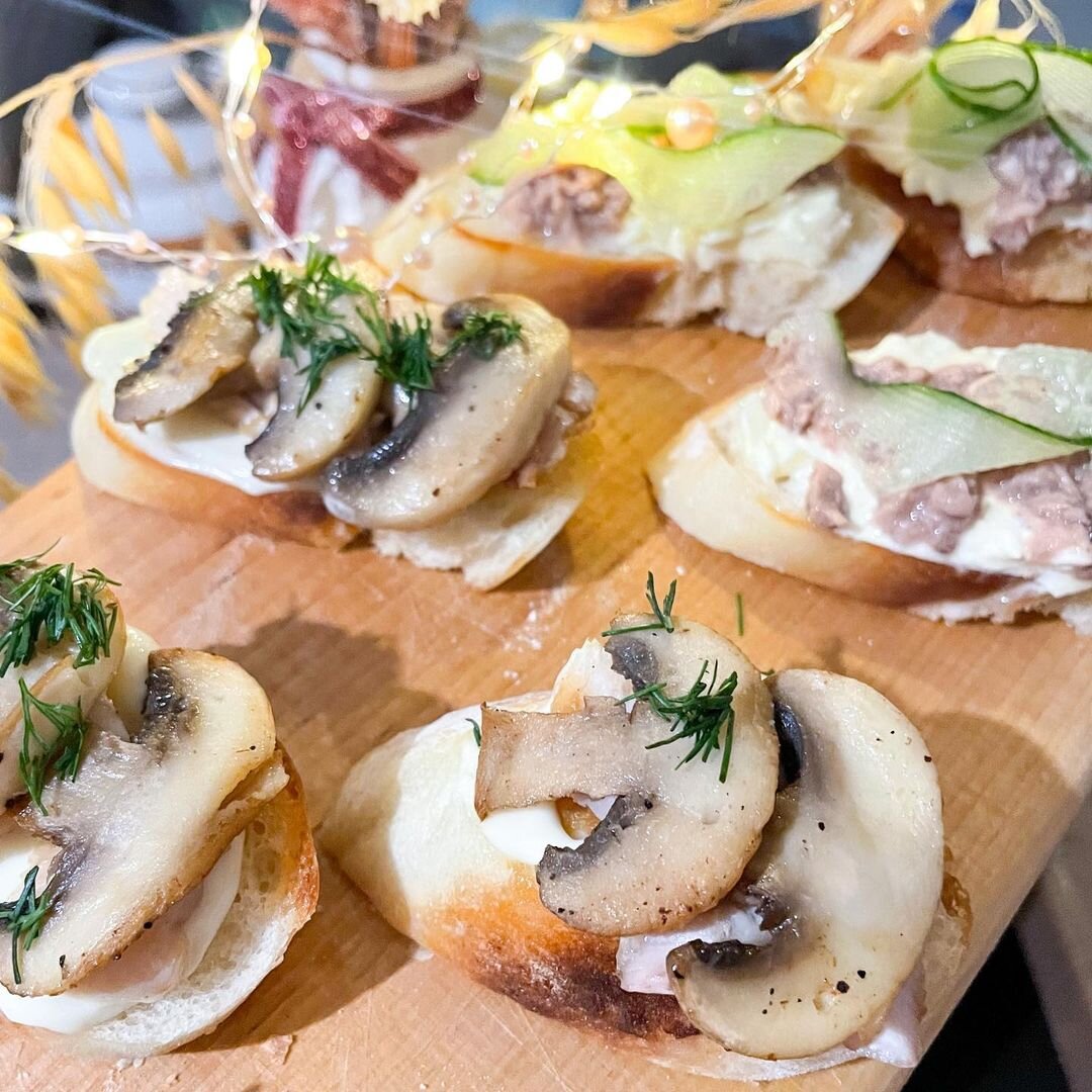 - багет намазать сыром,выложить курицу,сверху грибы и украсить зеленью