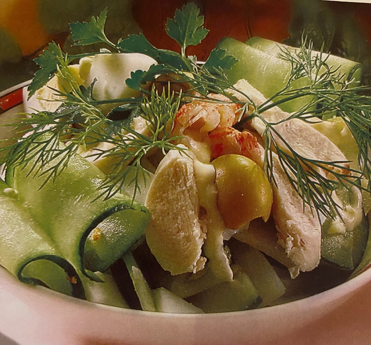 - Мякоть птицы, картофель, огурцы, яйцо нарезать ломтиками. Соединить нарезанные продукты и заправить майонезом, добавить соль, перец. Оформить мякотью птицы, яйцом, огурцами, креветками, маслинами, веточками зелени.