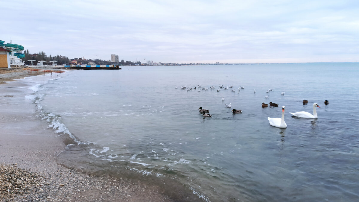 На зимовку в Феодосийский залив прилетели лебеди🙂 Причём я увидела их не сразу. Они плавают не там, где все утки, а чуть левее, если стоять лицом к набережной. Как правило, лебеди предпочитают сторониться людей. Но если чувствуют себя безопасно, то вполне общительны) Люди кормят лебедей хлебом и печеньем. А те и рады стараться🙂 Подплывают и чуть ли не с рук едят предложенное лакомство. В естественной среде лебеди, конечно же, хлеб не едят. Питаются водорослями и мелкими рыбешками. Но, как говорится, халяве рады все - даже лебеди)) Эти птички довольно большие. И мне, честно говоря, было бы страшно их кормить... Говорят, взмахом крыла лебедь может сломать руку человеку. И клювы у них мощные... В этот раз плавала только пара лебедей. И они совершено ручные! При мне женщина кормила одну птицу хлебом. А тот, не торопясь, выходил из воды и брал у неё из рук хлеб. И также, не торопясь, заходил обратно в воду. Забавно наблюдать 😊 Жаль дочки со мной не было, она была бы в восторге. Но