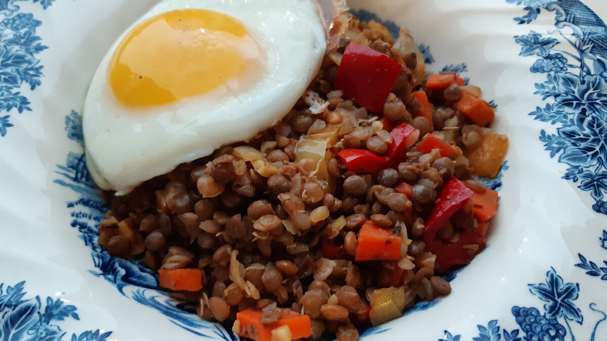 7. Разложить чечевицу с овощами по тарелкам и сверху выложить яйцо.