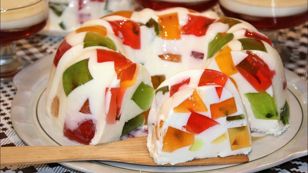 ЧТО НАДО: -сметана 400гр -сгущенка 300гр -желатин 25гр +вода 150мл Для желе: -желе разных вкусов -горячая вода ГОТОВИМ: 1 . Желе готовим как написано на пачке. Наспать в емкость, залить горячей водой, перемешать до застывания и оставить в холодильнике ~на 3 часа. Можно уже вытащить с холодоса сгущёнку и сметану чтобы были комн. тем. 2 . Как желе застынет. Нарезаем его на кубики прям в тарелке. 3 . 25гр желатина растворить в 150мл воды 4 . Смешать сметану, сгущёнку и желатин И далее всег соединяемых как на видео. И отправляем в холодильник примерно на 4 часа. На дно я положила слой печенья, его можно не ложить, если не хотите. Он вам точно понравится: )