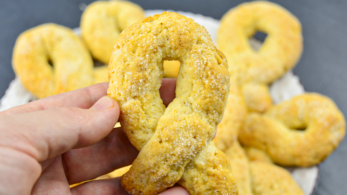 Я уже давно уяснила одну простую истину, что даже при наличии дома самых простых продуктов, можно приготовить очень вкусное домашнее печенье. В соответствии с этим рецептом, я готовлю тесто на сметане, а выпечка получается нежной, рассыпчатой внутри, не жесткой, что также очень важно! Сам процесс приготовления не является сложным. Можете ознакомиться с рецептом прямо сейчас с пошаговыми фото: 1. Замешать крошку из муки и мягкого сливочного масла. Я перетираю эти 2 продукта руками. 2. Добавить к ним разрыхлитель, порцию сахара. 3. Перемешать ложкой. 4. Добавить сметану - процент жирности не имеет значения. Я привыкла использовать или домашнюю сметану, или с магазинную, но с жирностью от 20%. 5. Замешать тесто - мягкое и совсем не липкое. Оно отлично держит форму. 6. Переложить тесто на стол и разминать в течение минуты. 7. Раскатать в толстый жгут и нарезать его на 18 частей – они и будут крендельками. 8. Из каждой из порции теста раскатать более тонкий жгутик - длиной около 20 сант