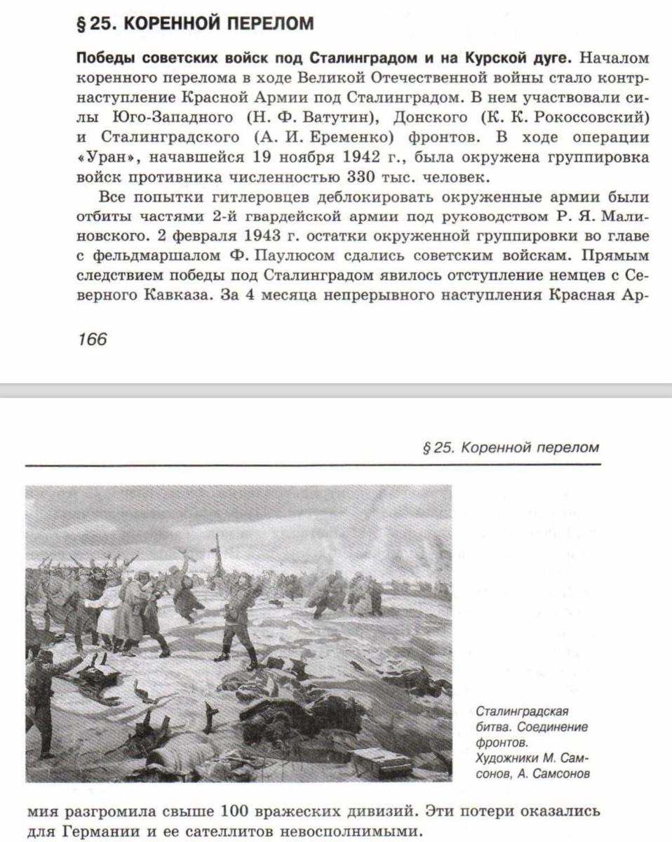 Полистали учебник по истории, который просят проверить на наличие искажений, касающихся событий Второй мировой войны. Ранее Президент обратил внимание на диспропорцию фактов описания Сталинградской битвы и Второго фронта. Судите сами, в пособии «Россия и мир» для 11 класса под редакцией доктора исторических наук и почетного профессора Московского областного госуниверситета Олега Волобуева о Сталинграде написано ровно два абзаца (скрин). Сам 89-летний специалист согласен с тем, что материал дан кратко. Объясняет это тем, что разработанный в 2013 году курс был направлен на повторение пройденного. Сейчас такую программу в школе уже не читают, однако используют в колледжах. Подпишись на тг-канал Любитель истории, чтобы не пропустить самое интересное об истории.