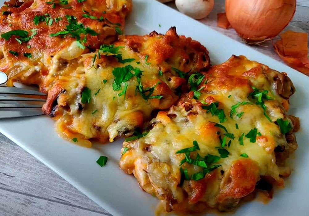 Так сейчас я продолжу рассказывать, как готовить блюда из первого поста. Сегодня мясо по-французски. Продукты нужные для приготовления≈ 10 порций. Свинина - 1 кгШампиньоны - 1 кг Лук репчатый - 2 шт. Сыр твердый - 100 грамм. Сыр адыгейский - 100 грамм. Помидоры красные - 2 шт. Горчица (готовый соус) - по вкусу. Соль - по вкусу. Перец черный молотый - по вкусу. Масло растительное - для жарки. Начнем приготовления. 1.Моем грибы, режем и ставим на разогретую сководку с растительнлм маслом жарится. 2.Добовляем к этому лук кольцами. 3.Жарим это всё до выпаривания воды, а лук должен быть прозрачного цвета. 4.Натираем сыр на тарелки и режем мясо на куски толщиной примерно 1,5-2 см. 5.отбиваем мясо. 6.Выкладываем на противень отбивные, но не забываем постелить на противень бумагу для выпечки. 7.Мажем на отбивные горчицей и солим, потом кладём на это грибы с луком. 8.Кладем ещё сверху помидоры, сыпем сыром. 9.Ставим всё это в духовку на 200° и печём 35 минут. Ваше блюдо готово