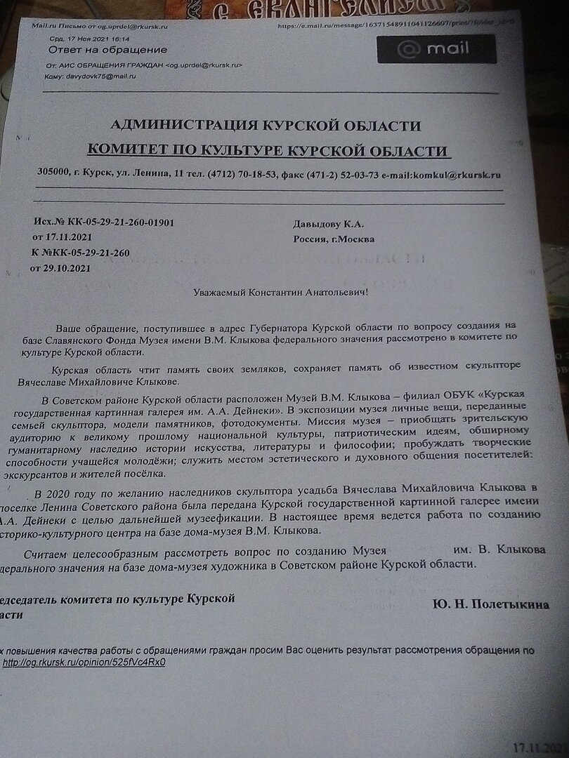Получен ответ из правительства Курской области на обращение о поддержке создания Федерального Музея В.М. Клыкова