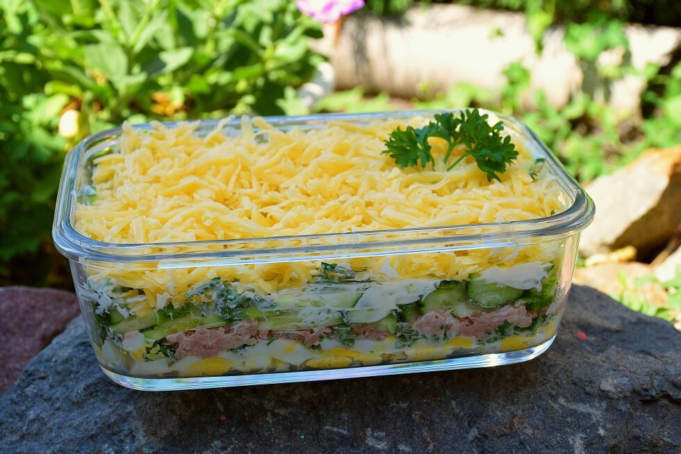 Порадуйте своих гостей! С удовольствием представляю вам три вкусных салата к Новому Году. Все салаты очень вкусные и сытные. САЛАТ С ТУНЦОМ Необходимые продукты: Важно! Соль в салат не добавляйте, иначе пересолите. Тунец сам по себе соленый. Приготовление Шаг 1 Яйца отварите, охладите, порежьте кубиками. Сыр натрите на крупной терке. Огурец нарежьте брусочками. Консервированный тунец разомните вилкой в отдельной емкости. Петрушку мелко порубите. Шаг 2 Выкладываем салат слоями: Приятного аппетита! САЛАТ "МЯСНОЙ" Необходимые продукты: Приготовление Шаг 1 Филе куриной грудки отварите в подсоленной воде до готовности. Это где-то 20-25 минут. В воду обязательно добавьте черный перец горошком и лавровый лист. Так грудка будет ароматнее. Охладите, порежьте кубиками. Репчатый лук обжарьте 2-3 минуты, добавьте порезанные пластинками грибы. Обжаривайте до готовности на медленном огне примерно 10 минут. Дайте остыть. Соленые огурцы и вареные яйца натрите на крупной терке. Сыр натрите на мелкой