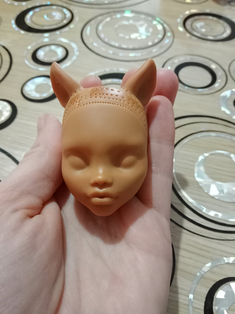 Здравствуйте! Меня зовут Катерина и я начинаю свой путь в создании ооак. Сейчас я работаю над проектом по преображению Клодин в девушку индейца. С монстряшками я имею дело первый раз в своей жизни, до этого училась на китайских шарнирных куколках с Алиэкспресс. Способ прошивки волос, которым я пользовалась раньше, мне не очень нравился, даже описывать его не буду. И вот, взявшись наконец то за красотку Клодин, встал вопрос, как же прошить ей голову, что бы было надёжно, но при этом не сильно затянуто по времени. Обратившись за помощью к великому и могучему интернету, была найдена интересная идея прошивки с помощью клея- пистолета. Головушка очищена от старых волос и макияжа. Можно приступать. Прошивать буду иголкой, самой длинной, какая у меня нашлась. Иголку, со стороны ушка, муж мне заострил, что бы была возможность втыкать с внешней стороны, а не искать дырочку наощуп изнутри. Вот таким образом втыкаю иголку, продеваю сквозь ушко прядку волос. Для прошивки я использую тресы длинн