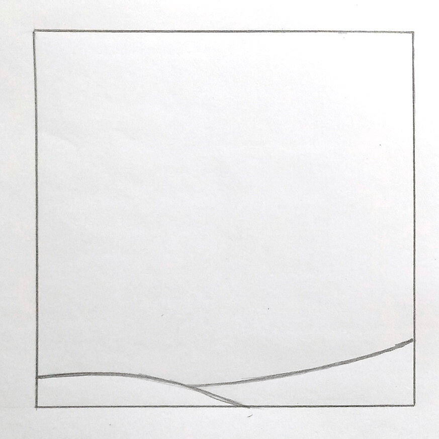 В работе есть ошибка (но об этом позже). Найдете? Я рисую в квадрате, вы можете рисовать на листе бумаги, не ограничивая себя рамкой. 1. Наметьте землю. Проведите одну, или как у меня две линии. Они должны быть плавные, как ложится снег.