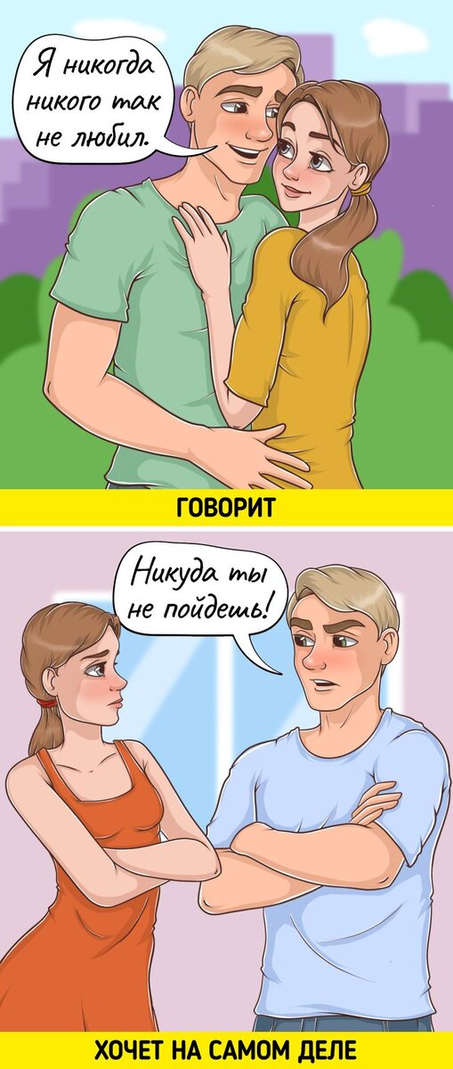 1. «Я никогда никого так не любил(а)» Перевод: «Влюбись в меня скорее — так мне будет легче контролировать тебя». 2. «А вот ты...» Это можно назвать переводом стрелок. Когда кто-то указывает токсичному человеку на его неприемлемое поведение, тот делает ответный выпад. Если вы высказываете недовольство скажем, тем, как ваш партнер выполняет обязанности по дому, он может в ответ раскритиковать ваши родительские качества, личные пристрастия или даже карьерные достижения. Перевод: «Не хочу обсуждать мои недостатки — лучше обсудим твои». 3. «Если любишь меня, то...» Перевод: «Знаю, как сильно ты меня любишь, а потому сыграю на этом и получу то, что хочу». 4. «Больше я с тобой не разговариваю» Нормально — сообщить человеку, что вы не хотите разговаривать с ним какое-то время, чтобы разобраться в собственных мыслях и чувствах. Ненормально — всякий раз при возникновении конфликта решать его путем тотального бойкота. Это манипулятивная тактика: абьюзер наказывает жертву молчанием или пытается т