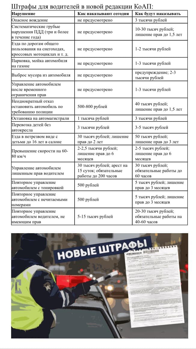 По росту штрафов привожу информацию ниже. Расходы нарушителей теперь весьма чувствительно увеличатся по всем статьям, но по некоторым – особенно. Так, если раньше за игнорирование требований автоинспектора остановить машину штраф составлял терпимые 500- 800 рублей, то теперь он поднят до 40 тыс рублей, то есть до суммы, перекрывающей среднюю зарплату во многих регионах. А еще за это нарушение можно и прав лишиться на 1,5 года. За повторное управление автомобилем с тонировкой штраф вырастет с нынешних 500 рублей до 5 тыс с риском остаться без прав на 1,5 месяца. Та же история с грязными номерами.