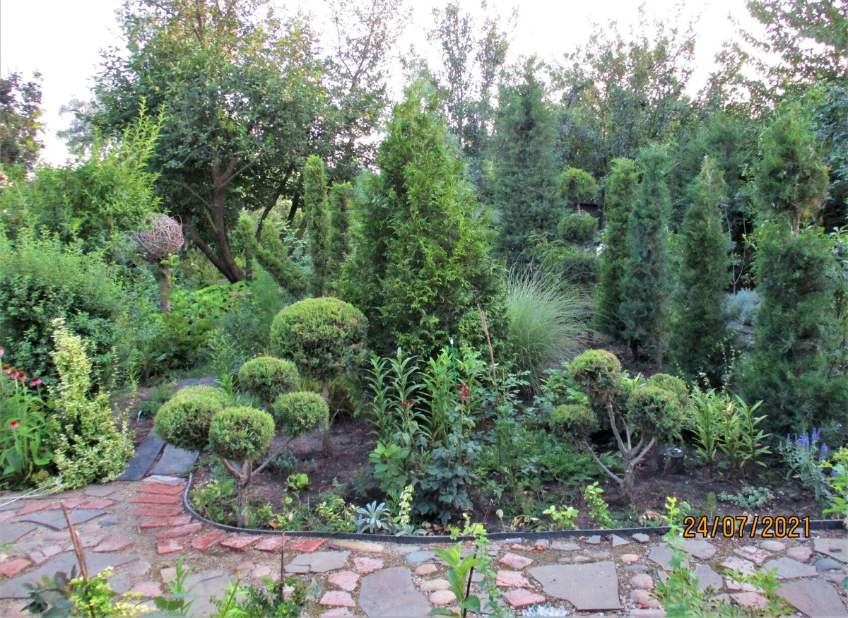 Туя восточная , справа можжевельник виргинский- стрижку делаю на шести ветках. Все остальные вырезала. Мне понравились его искривлённые ветки и решила их оголить. В центре растёт мискантус, который не поливаю.