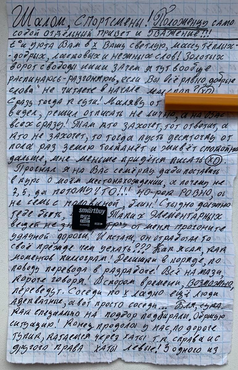 Привет! Во избежания многих вопросов и недопонимания, а также: о чем этот блог, кто мы такие (Арестант и Лисичка), навигация по каналу ЗДЕСЬ. Мы обращаем внимание, что любая информация в блоге носит повествовательный характер, и ни в коем случае НЕ пропагандирует нездоровый образ жизни, а наоборот - имеет цель предупредить читателей о проблемах с зависимостями и законом. Читать рукопись с фото не нужно - текст напечатан ниже. Малек очень юморно написан, но есть очень жесткие моменты, сразу предупредила :-) Шалом, спортсмены! Положенцу само собой отдельный привет и уважение!!! Тепла и уюта Вам в хату Вашу светлую, массу теплых, добрых, ласковых, нежных слов! Золотых ворот свободы… ииии зачем я тут вообще распинаюсь-разгоняюсь, если Вы все равно «добрые слова» не читаете в начале мальков? :-) Сразу тогда к сути! Маляву от Арестанта видел, решил отписать не лично, а на Вас всех сразу! Там кто захочет, тот ответит, а кто не захочет, то тогда пусть десяточку от пола раз землю толканёт и жив