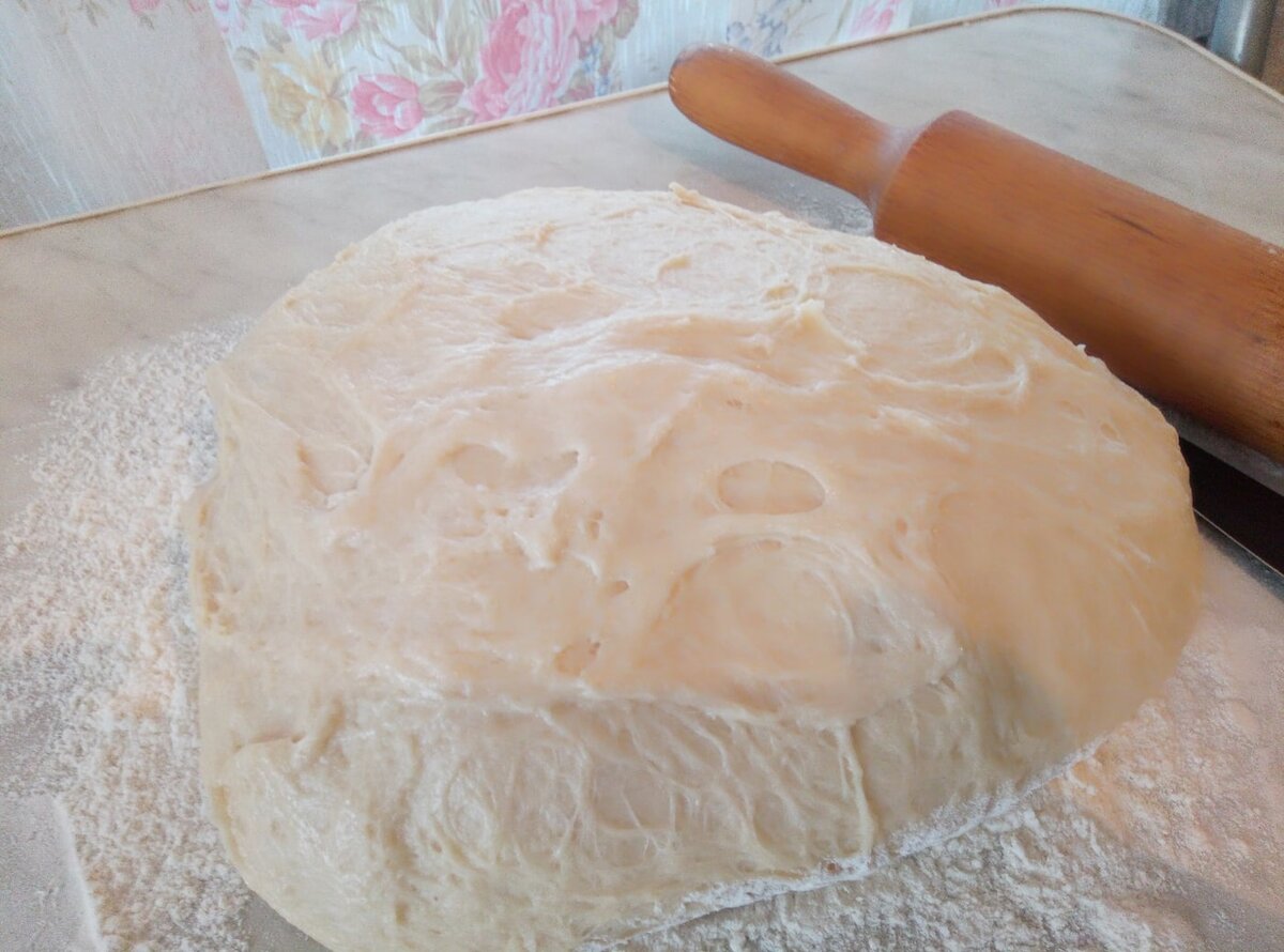 Когда тесто подошло, предпочитаю для удобства раскатки делить тесто на 3 части.