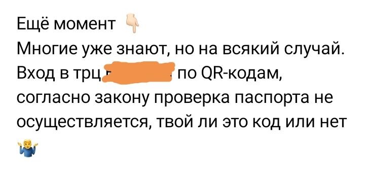 Везде (ну или почти везде) ввели коды. Для посещения ТРЦ и тд. Но!!!! Охрана ТРЦ не имеет права смотреть паспорт. Увидел просто на просторах инета. Вот такое обьявление. Уточнил. Да действительно. Данные спокойно продаются от госуслуг. Где и как. Не скажу никому и никогда. Уточнял с темным селлером(продавцом) нюансы. Чисто ради интереса. Выяснилось. 1) Что услуга востребована. 2) что чиновники опять облажались. 3) я в деревне живу. И мне по хер на все запреты. И код мне не нужен. Так что вот так. Наши тёмные дельцы поставили на поток это все. А люди не теряются. Люди хотят в трц ходить))) но не ширяться. PS-Не рекомендую и не призываю к действию. Просто поделился своими наблюдениями. Всем не болеть.