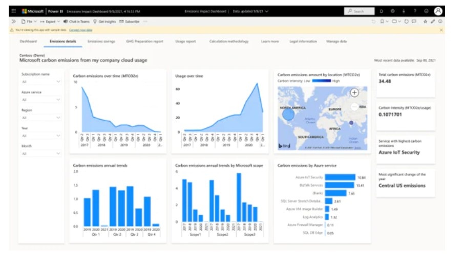 Обычно, когда пишут о выбросах парниковых газов, приводят в пример “грязные” промышленные производства - металлургию, производство строительных материалов, транспорт. Но “цифровые гиганты”, такие как Microsoft, Amazon, Google также вносят свой немаленький вклад в глобальное потепление - их дата-центры потребляют огромное количество электроэнергии. И далеко не вся она зеленая. Да и для клиентов “цифровых гигантов” пользование их дата-центрами не проходит бесследно, в смысле выбросов СО2. Такого рода выбросы пользователи облачных сервисов цифровых гигантов должны учитывать в своем подсчете выбросов третьего уровня (Scope 3). Чтобы облегчить своим клиентам задачу мониторинга и учета углеродного следа от пользования облаком Microsoft, компания разработала систему наглядных дашбордов Microsoft Sustainability Calculator. Не отстает от Microsoft и Google, разработавшая свой набор “климатических” инструментов. “Цифровые гиганты” сегодня стремятся также сократить свои собственный парниковый сл