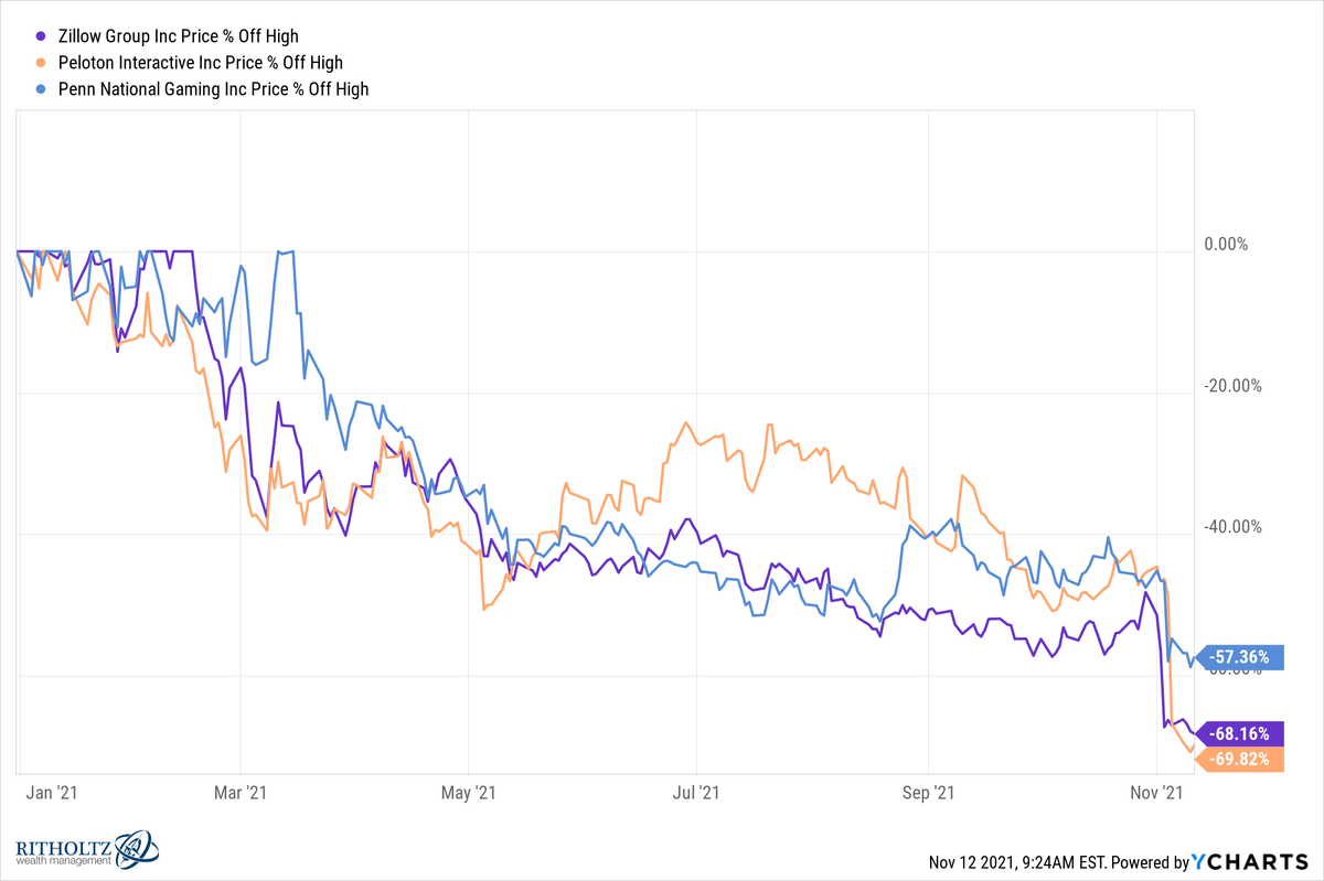 Этот год был одним из наименее волатильных за всю историю наблюдений. Худшая просадка от пика до минимума по $SPX составляет всего 5%. Тем не менее, почти треть всех компаний из индекса прямо сейчас находятся в просадке на 20% или больше. Это верно, даже при рекордных максимумах более 30% компаний, включённых в индекс УЖЕ!!!! находятся в медвежьем