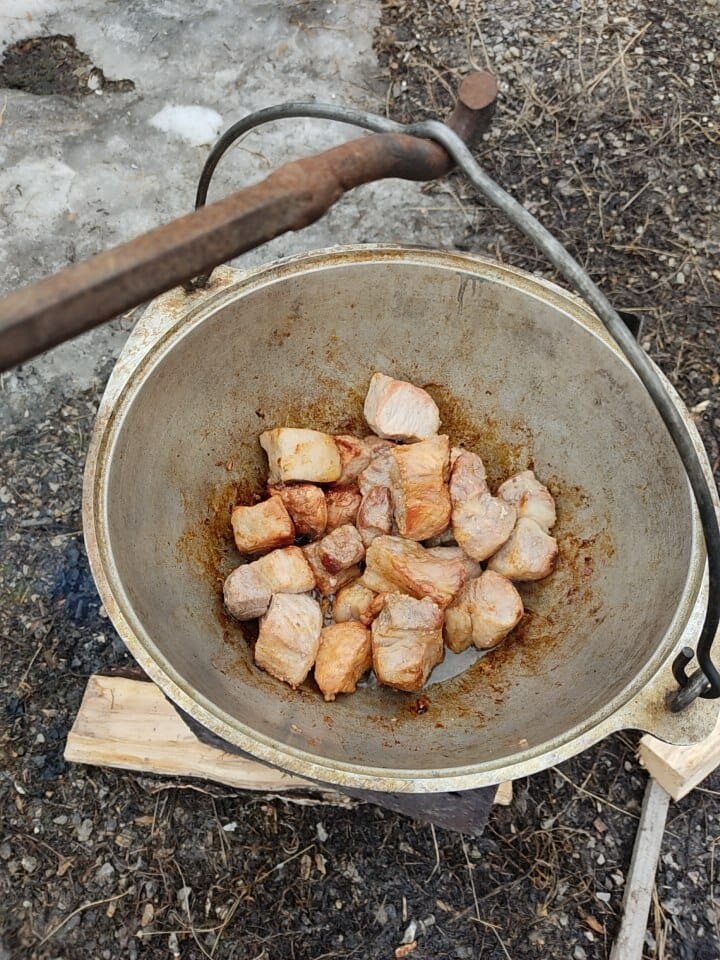 Чтобы Ваша шурпа получилась вкусной и сытной, лучше брать мясо с жирком. Варить данное блюдо можно как Вам вздумается! Я люблю шурпу на костре. Ингредиенты: · Свинина с жиром – 1,5 кг. · Перец сладкий – 2 шт. · Томаты - 3 шт. · Чеснок – 1 головка. · Репчатый лук – 1 шт. · Морковь – 2 шт. · Картошка – 3-5 шт. · Укроп – 1 пучок. · Соль – по вкусу. · Кориандр – 5г. · Вода Для того, чтобы приготовить шурпу на костре, нужно сначала всё правильно подготовить. 1. Нарежьте мясо небольшими кусочками. Почистите лук и нашинкуйте средним кубиком. Морковку очищаем и также нарезаем средним кубиком. Из перца извлекаем сердцевину и нарезаем кубиком. Томаты нарезаем большим кубиком. Картошку следует очистить и нарезать крупнее среднего. Головку чеснока режем небольшими слайсами. Зелень нарезаем как нравится. 2. Разогреваем казан и кладем кусочки мяса. Масло не нужно! Готовим на срезанном сале. Обжариваем кусочки до золотистого состояния. 3. Дополняем мясо морковью и луком. Даём несколько минут для тог