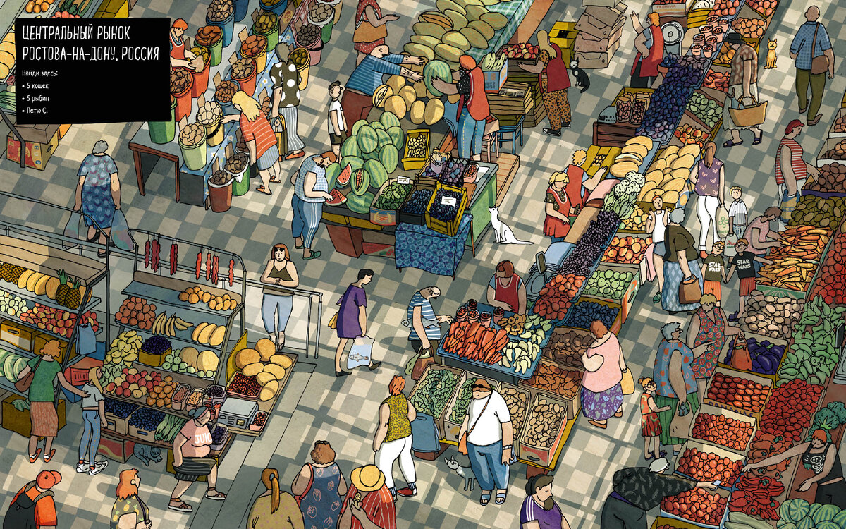 Кажется, подарок на ближайшие праздники можно уже не искать. Кстати, о праздниках: думаете, мы про зимние? Нет ещё. Впереди ведь выставка Non/fiction в Москве! Второе по величине книжное событие года! Так вот, у нас к выставке Non/fiction выходит книжища про рынки, от Анны Десницкой - иллюстратора "Старой квартиры" и "Транссиба"! Там нам вдогонку пиар-отдел говорит про пять причин и всё такое, но какие нужны причины, чтобы пойти на рынок? С утра пораньше с сумкой-тележкой, чтобы успеть купить самые свежие продукты? (На первой картинке, кстати, тут рынок в Ростове на Дону). Как насчёт рынков в других странах? Израиль: зимой там сезон клубники! На тайском рынке можно найти самые экзотические фрукты, в том числе дуриан, который запрещено вывозить из Таиланда. Эфиопия: попробуй местную выпечку самбусу. Сан-Франциско: тут продаётся мороженое с самыми невероятными вкусами — «Арахисовая паста с шоколадным печеньем» или «Клубника с засахаренным халапеньо». А, ну и это большой международный пр