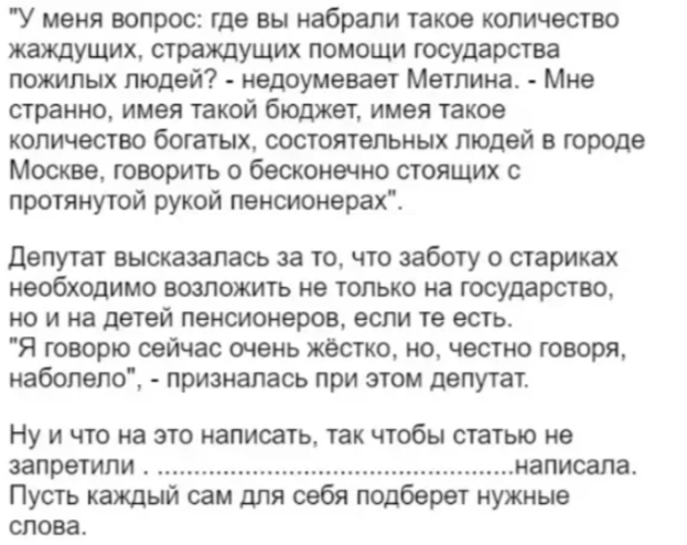 "Заставим детей содержать их пожилых родителей !" Дeпyтат Мосгордумы жеско ответил журналистке. Но она достойно ответила