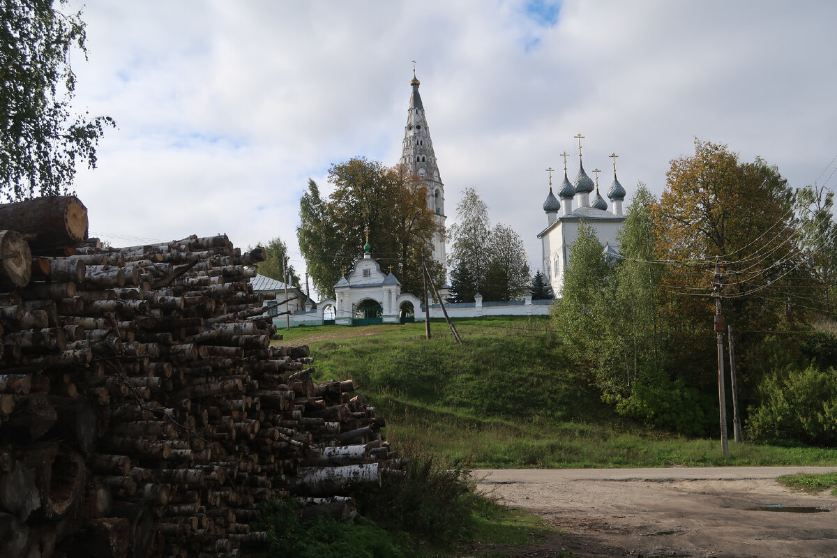 Всего лишь в 50 км от Костромы находится отлично сохранившийся провинциальный купеческий городок Судиславль. В прошлом это был один из центром старообрядцев и неофициальная грибная столица России. Осмотрим его улицы и старые дома потрясающей красоты Как и во многих малых городах России , на центральной площади стоит памятник Ильичу напротив огромного храма В Судиславле на холме стоит Преображенский храм с колокольней. Раньше здесь была мощная крепость, построенная по приказу Ивана Грозного для защиты от набегов татар Городок с населением в 4,5 тысячи жителей имеет древнюю историю. Впервые упоминается под 1360 годом Лучшие годы Судиславля явно позади, сейчас он имеет статус поселка городского типа Поселок живет за счет деревообрабатывающей промышленности и производства изделий из меха на местном зверосовхозе В городке много потрясающих резных наличников, некоторые прям шедевры Есть также несколько купеческих особняков и усадьба местного магната Третьякова На парадной лестнице усадьбы Т