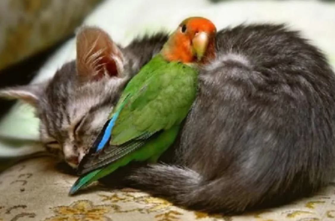 Попугай сторожит сон котёнка.
