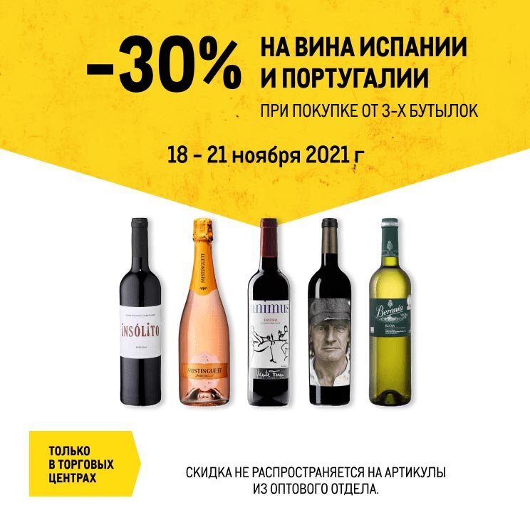 С 18 по 21 ноября скидка 30% на вина Испании и Португалии. При покупке от 3-х бутылок из ассортимента акции. На красные ценники скидка действует как дополнительная. Вина участвуют как тихие, так и игристые.