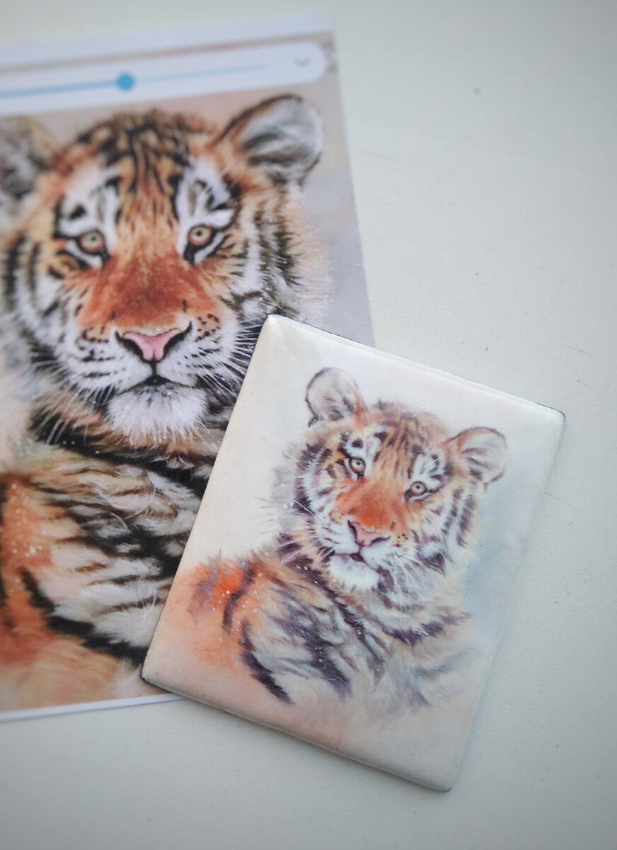 Ура, я-таки закончила своего снежного тигрёнка! Ах да, вы же не в курсе: к Новому Году мы на ПТД( производственная трудовая деятельность) расписываем тематические плакеты в технике финифть. Ну и год Тигра, вы поняли… Сегодня посвящу вас немного в этот трудоёмкий и нервный (иногда расслабляющий) процесс. У нас есть три вида красителей: туго-, средне- и легко-плавкие(быстро выгорают, становясь серыми), пишем мы ими друг за другом начиная с тугоплавких(пурпуры). Так что на первых прописках работы фиолетовая и выглядит так: После прописки работа прогревается, дабы не треснула и вплавляется в печи (t~600-800°). Кстати, роспись по эмали начинается с подготовки пластины, о которой много не скажу, нудно это. Мы долго-долго перетираем эмаль, потом выколачиваем медь и этой эмалью её покрываем. И только тогда начинается роспись. Затем в ход идут среднеплавкие расители - все цвета, кроме оранжевого, красного, чёрного, коричневых. Тут самое сложное - это набрать цвет нужной яркости. Ведь финифть са
