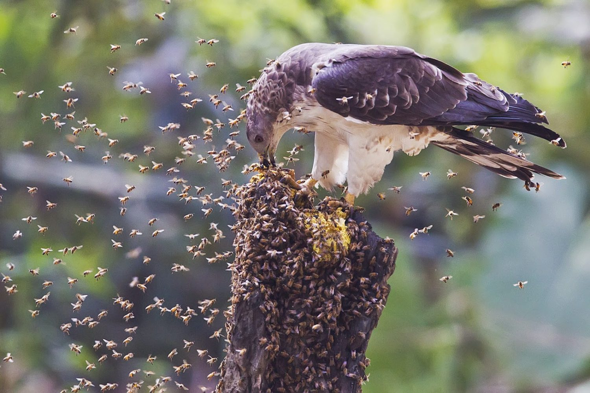 Мы с ужасом смотрим на то, как оса, окруженная насекомыми, разрушает их гнезда. Но опасения за птицу напрасны: она прекрасно приспособилась к тому, что различные жалящие насекомые не причиняют ей неудобств. Осоед - хищная птица среднего размера, распространенная в Европе и Азии. Этого пернатого можно легко спутать с другим крылатым хищником, если бы не его необычный рацион. Собственно, название "пожиратель ос" в данном случае говорит само за себя: птица ищет гнезда ос и пчел и поедает их личинок. Обычно во время еды вокруг осы летает разъяренный рой, но ничего не может с ней поделать. Все дело в необычном строении оперения осы. Детальные исследования перьев из различных частей тела птицы показали их отличительные особенности. Оказалось, что они намного жестче, плотнее и в то же время меньше, чем аналогичные хищные птицы. Но сами перья гораздо крупнее и они плотнее прилегают друг к другу – так что оса как бы в броне, под которую не так-то просто пробиться. Укусы ос и пчел не могут про