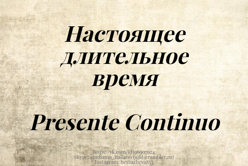 Употребляется в тех случаях, когда действие происходит в данный момент. При этом мы можем воспользоваться обычным настоящим временем (Presente), и поставить обстоятельство времени, указывающее на то, что действие происходит сейчас. Например: Adesso\ ora\ in questo momento vado a scuola. Но правильнее будет, если действие происходит прямо сейчас, воспользоваться настоящим длительным временем (Presente Continuo). При этом обстоятельство времени, указывающее на настоящий момент (adesso, ora, in questo momento) употреблять уже необязательно, поскольку сама форма глагола уже указывает, что действие происходит именно сейчас. Образуется Presente Continuoочень просто. В качестве вспомогательного глагола используется stare. Он и ставится в нужную нам форму (я, ты, он, она, Вы, мы, вы, они), а после него ставится деепричастие (Gerundio) от смыслового глагола. Я – sto + -ando/andosi, -endo/-endosi Ты – stai + -ando/andosi, -endo/-endosi Он / она / Вы (вежливая форма) – sta + -ando/andosi, -endo/-