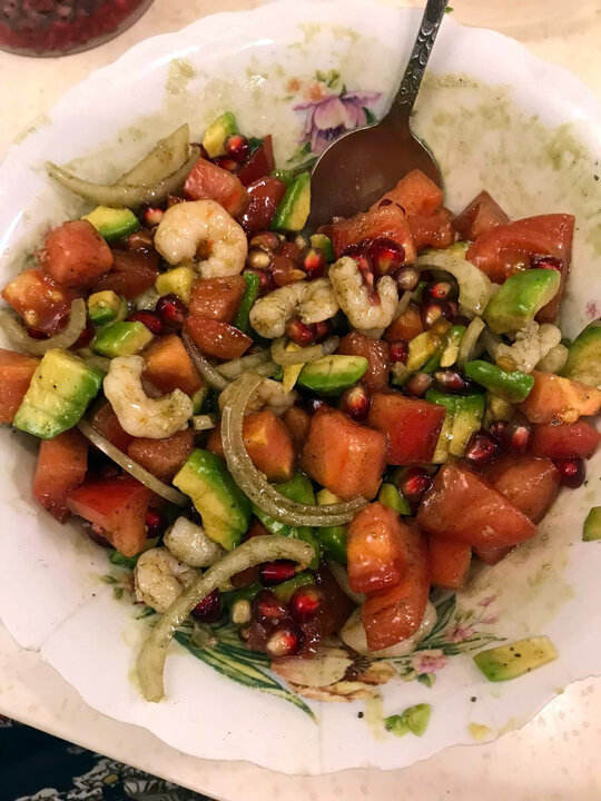 Очень вкусный салат. Помидоры, авокадо, лук, нарезать произвольно. Креветки в рассоле (или любые морепродукты- осьминожки, мидии, кальмары) добавить, предварительно слив рассол. Заправка - сок лимона, немного масла оливкового или тыквенного. И зёрна граната. Приятного аппетита! Больше общения и рецептов - в группе "Жизнь с диабетом" в Facebook! Рецепт на странице в Facebook Автор рецепта - Алевтина Догадкина