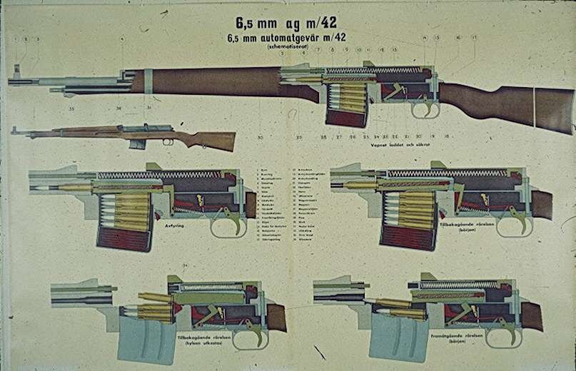 Шведы же озаботились созданием собственной самозарядной винтовки к началу Второй мировой войны, до этого обходясь своей версией "Маузера" под патрон 6,5х55. Началось все с попытки "малой кровью" переделать болтовые винтовки m/39 в самозарядные - как и прочие аналогичные конструкции времен интербеллума, "система Эрика Валлберга" с ее приводом затвора кулисой за обрезанную рукоять дальше опытов не пошла.