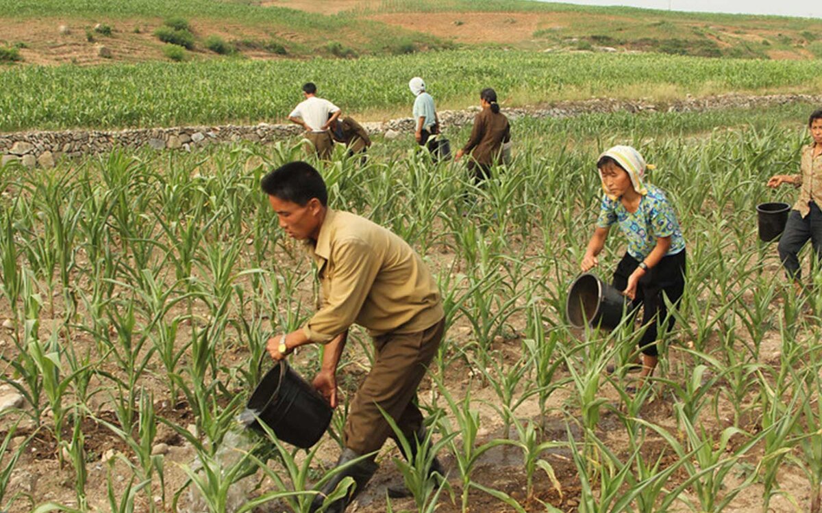 После пересечения границы Китая с КНДР ландшафт меняется как по мановению волшебной палочки: вместо суровых заросших деревьями гор, перемешанных с серыми, дымящими городами вдруг расстилаются за окном поезда ослепительной зелени рисовые поля, аккуратно отделенные друг от друга рядами картофеля и кукурузы. Корея - страна горная, земли, пригодной для сельского хозяйства, здесь не так много, и создается впечатление, что здесь засажено все, что только можно засадить, вплоть до склонов гор, на которых террасами подрастают саженцы кукурузы и разные овощи, зачастую под таким углом, что невозможно себе представить, как удалось забраться туда местному земледельцу. Трактор в таких местах, естественно, не годится, землю копают вручную или пашут на волах... На полях - буквально ни одного сорняка, даже на самых удаленных от дорог. Идеальные поля.