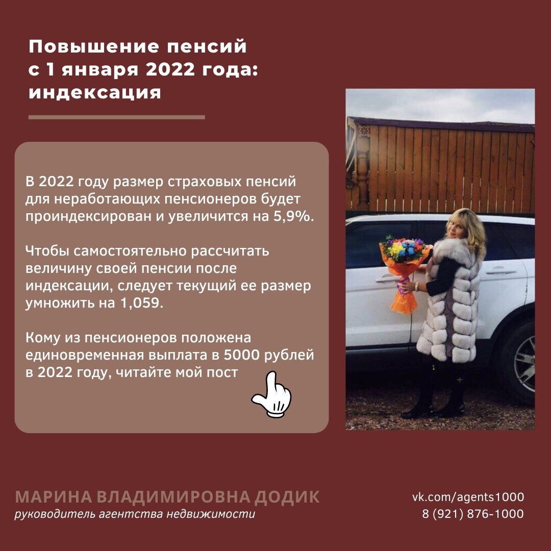 В 2022 году размер страховых пенсий для неработающих пенсионеров будет проиндексирован и увеличится на 5,9%. Размер индексации меняется ежегодно: -в 2022 году – 5,9%; -в 2021 году – 6,3% -в 2020 году – 6,6%; -в 2019 году – 7,05%. Чтобы самостоятельно рассчитать величину своей пенсии после индексации, следует текущий ее размер умножить на 1,059. Стоимость одного пенсионного балла с января 2022 года составит 104,69 рублей. Размер фиксированной части будет равен 6401,10 рублей. Также с января на 5,9 % повысят доплаты пенсионерам за иждивенцев, за северный стаж, за сельский стаж и возраст старше 80 лет. По словам Татьяны Голиковой средний размер пенсии в 2022 году составит 18521 рубль, в 2021 году средний размер страховых пенсий составляет – 15744 рубля. Эти суммы рассчитываются на основе всех выплат, положенных пенсионеру. В 2023 и 2024 годах страховые пенсии по старости проиндексируют не менее чем на 5,6 и 5,5 процентов соответственно. Данное увеличение не коснется работающих пе