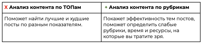 Чаще всего контент анализируется по различным ТОПам. Например, ТОП-постов по лайкам покажет, на какие фото подписчики реагируют лучше, а ТОП-постов по комментариям ― темы, на которые любят общаться. Но мало кто анализирует эффективность постов по рубрикам (темам). Часто бывает, что отдельный пост зашел подписчикам, а вся рубрика нет и тянет на дно вовлеченность.