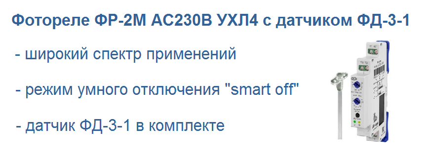 Фотореле ФР-2М AC230B УХЛ4 с датчиком ФД-3-1 используется для автоматического включения и отключения освещения на улице, в доме, витрине магазина, на автостоянке, а также для управления системой автоматического полива, включения подогрева теплиц и т.д. Контроль уровня освещённости осуществляется выносным фотодатчиком ФД-3-1, который входит в комплект. Реле имеет режим умного отключения "smart off". В этом режиме пользователь может сам задать время включения освещения после наступления сумерек в интервале от 30 минут до 7 часов. В вечернее или ночное время реле включит освещение или рекламу и через заданное время выключит. Реле позволяет значительно сэкономить на потребляемой электроэнергии. Реле может быть использовано для управлением маяками. При наличии дистанционного канала управления (радиоканал и т.п.) можно осуществлять одновременную дистанционную настройку момента включения нескольких маяков. При поступлении команды по каналу управления, реле запомнит текущий уровень освещённост