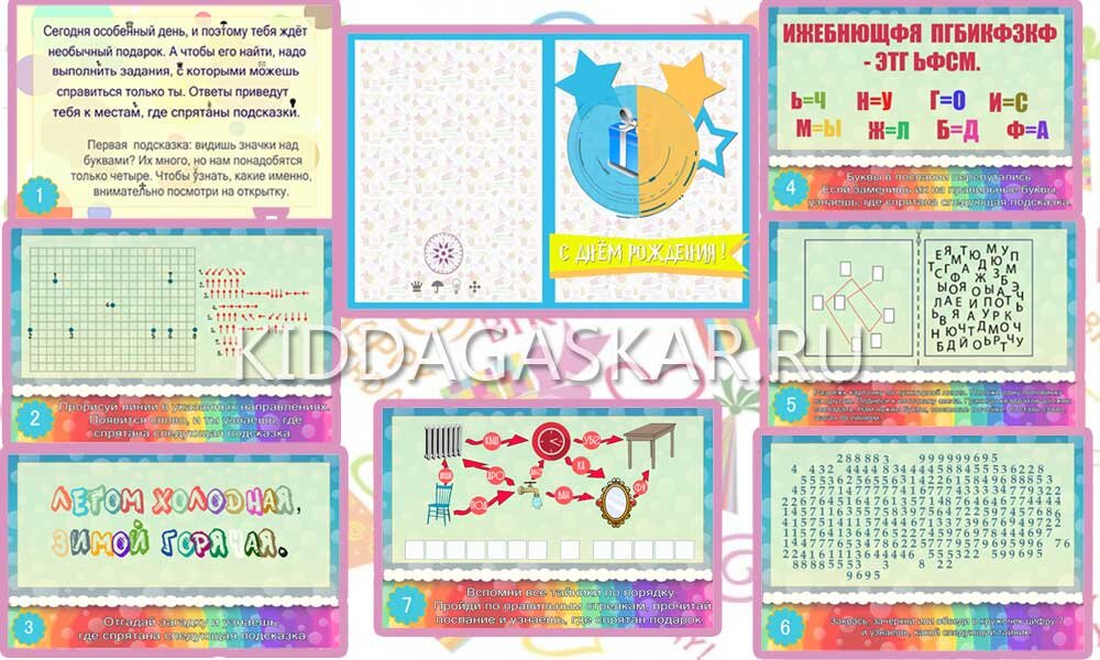Можно просто подарить подарок, а можно устроить небольшой сюрприз - поиск подарка по запискам. Мы подготовили карточки с заданиями для самостоятельной распечатки. Вам останется только вырезать, спрятать и наблюдать :) 💥 Особенность формата "квест для детей по запискам" в том, что распечаток получается немного. В этом сценарии их всего 5. Задания (всего заданий 7 штук) простые и разнообразные. А подготовка к квесту займёт не более 15 минут. Квест начинается с открытки. Макет есть в материалах. Её можно вручить, положить в почтовый ящик или спрятать и отправить имениннику сообщение с указанием, что в таком-то месте его ждёт сюрприз. Задания не объединены одной тематикой, как, например, в шпионском или археологическом квесте. И в этом есть плюс - не надо долго думать, какой готовый сценарий квеста на детский день рождения выбрать. Итак, в открытке мы получаем первую подсказку, которая приводит нас к тайнику. Там следующая записка. Задания простые, разнообразные и ни одно из них не треб