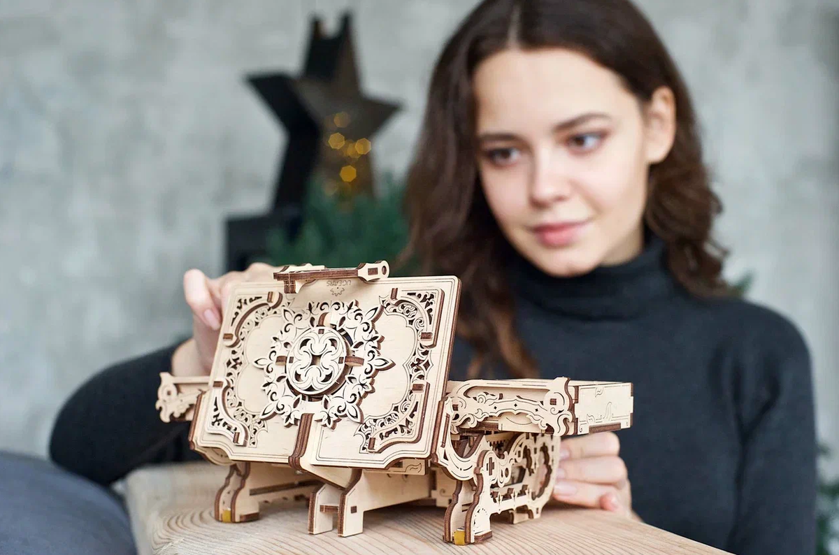 При этом Ugears не просто предмет декора, который будет просто стоять на полке — все модели функциональные. Взгляните, например, на эту красивую «Янтарную шкатулку» в восточном стиле.