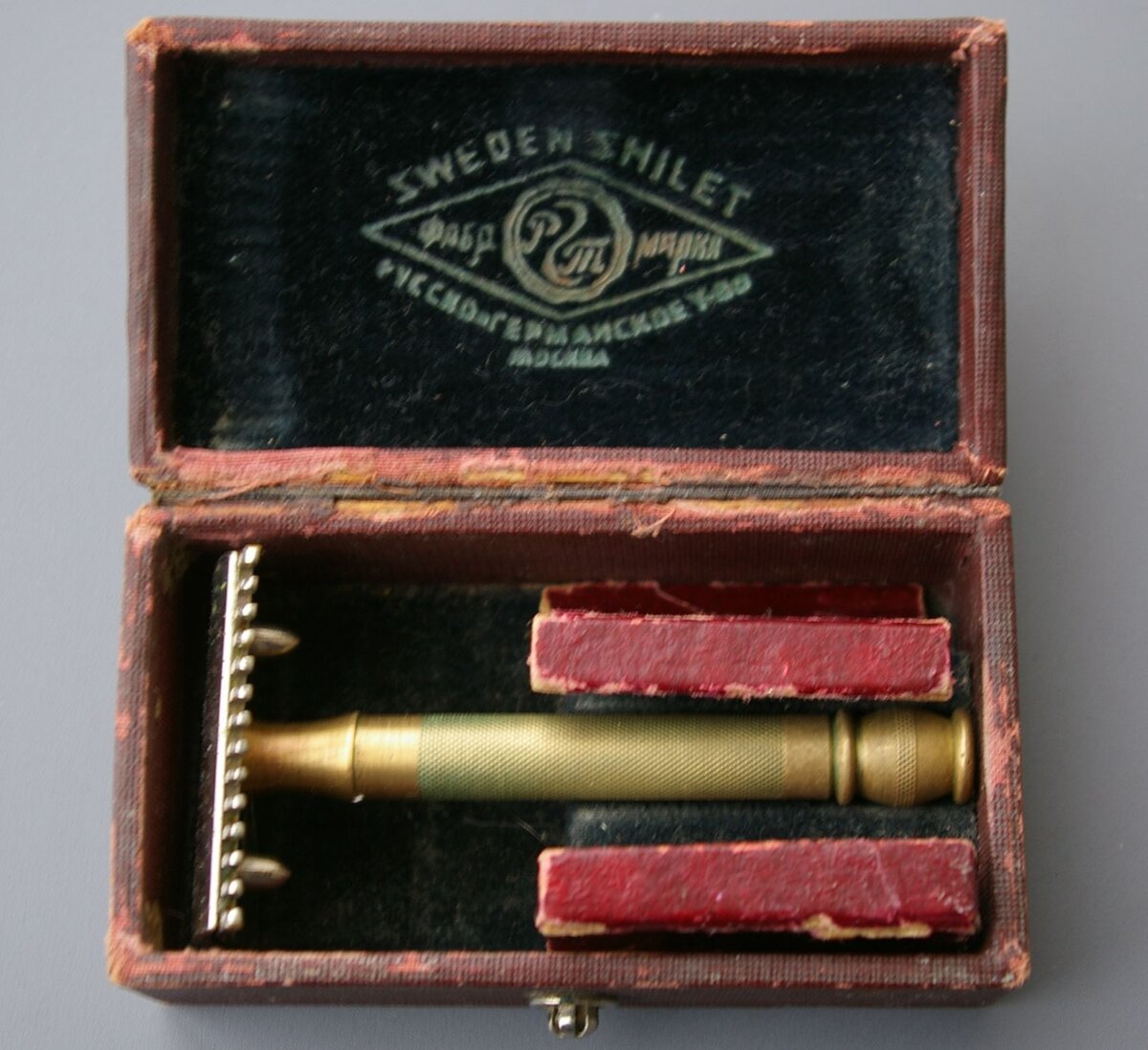 Очередной бритвенный прибор Русско-Германского товарищества "Sweden Shilet" (РГТ), 1927 - 1929. Производственные показатели РГТ за 1928 - 1929 годы, приписанные тресту "Мостремасс", которого тогда еще отродясь не было. Замена футляра "по позиции". В коллекции имеются одинаковые футляры "Интома", причина - артель применяла четыре типа клейм, а, значит, столько же типов станков. Каждому - своя коробочка. Замена футляра. Импортировать свою продукцию "Интом" начал в 1931 году. Знавший лучшую жизнь бритвенный прибор завода "Красная звезда", 1951 - 1952 годы. Пластмассовые детали пока еще не собственного производства, а Карачаровского завода пластмасс. Бритвенный аппарат "Турист" Завода аппаратов безопасных бритв, 1955 - 1956 годы. В дальнейшем нижняя часть ручки будет изготавливаться из карболита. Белого или коричневого. Бритвенный аппарат "Ленинград" ленинградского Литейно-механического завода, 1962 - 1971. Чинка для карандашей с клеймом "БОР - ВОС". ВОС - Всероссийское общество слепых, БО