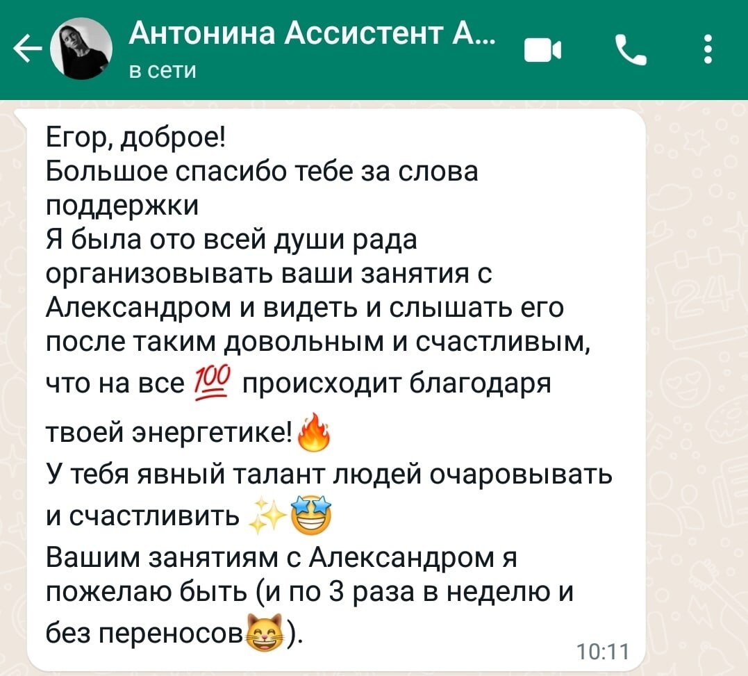 Вот так началась эта история. Мы проработали с Сашей (тот самый бизнесовый парень) порядка 2 месяцев. И то, что я вижу, это просто потрясающе. Но я сколько угодно могу хвалить свою работу. Я лучше, с позволения Антонины (ассистента Саши) прикреплю ее "отзыв", а точнее часть нашей переписки, которая идет постоянно, так как Антонина следит за результатом и организовывает все занятия для Саши.