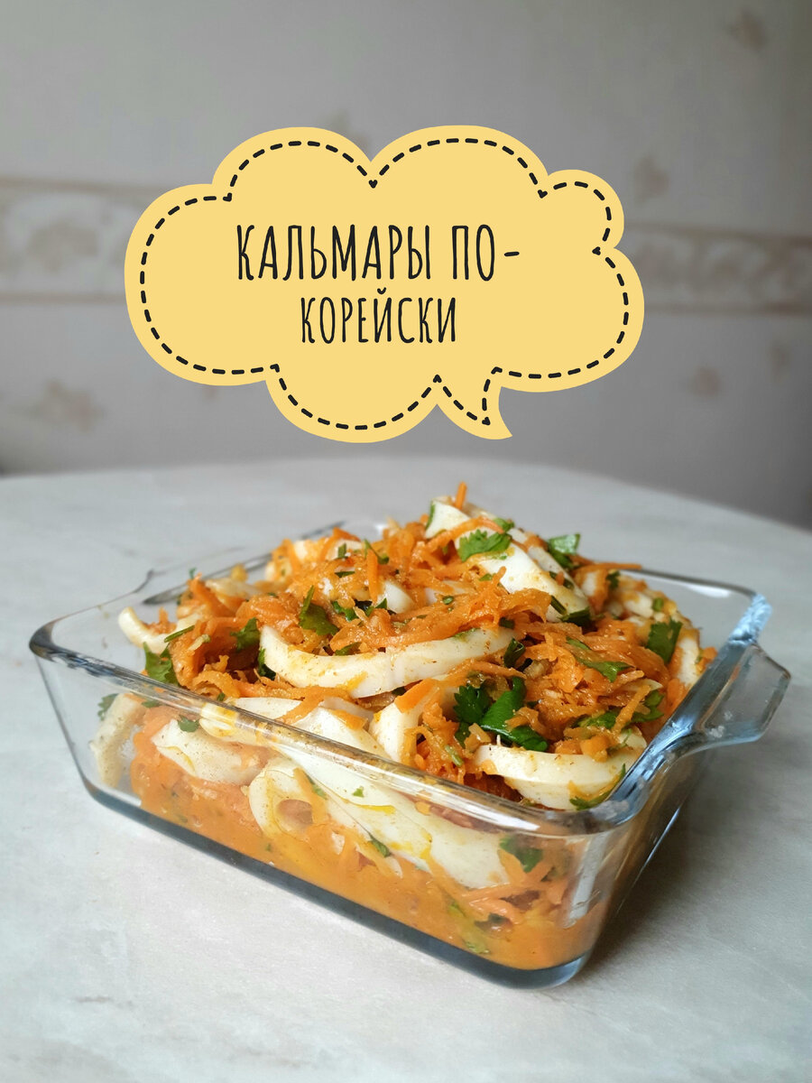 КАЛЬМАРЫ ПО-КОРЕЙСКИ Это было бы прекрасное во всех смыслах блюдо - в плане простоты, быстроты, вкуса и пользы, если бы не приходилось возиться с тушками кальмаров. Но вдруг это вас не остановит или вы являетесь счастливыми обладателями тушек, с которыми не нужно возиться, то обязательно попробуйте! :) Ингредиенты на 3 тушки кальмаров: 3 морковки 3 зубчика чеснока 3 ст.л. раст.масла 1 ст.л. рисового или яблочного уксуса 2 ч.л. приправы для корейской морковки (кориандр, кр.острый перец) 1 ч.л.соли Несколько веточек кинзы Приготовление: Кальмары разморозить, очистить от пленок, вытащить хитиновую пластину, промыть. Опустить в кипящую подсоленую воду, варить не больше минуты. Слить воду, нарезать кольцами. Морковь натереть на специальной терке для корейской морковки. Или обычной, тоже будет отлично :) Выложить в миску морковь, чеснок, насыпать сверху, в центральную часть, специи, соль. Залить их очень горячим раст.маслом. Добавить кольца кальмаров, уксус, нарезанную кинзу, хорошо перемеш
