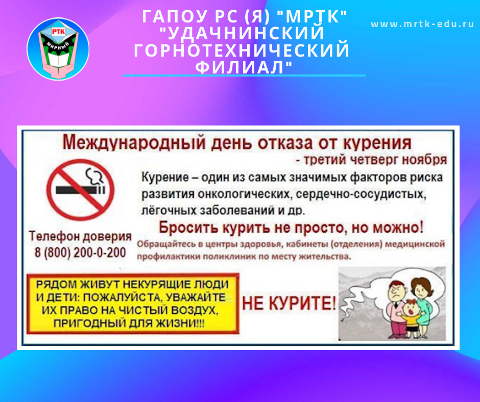 С 15 по 19 ноября 2021 года в «Удачнинском горнотехническом филиале» МРТК кураторами учебных групп и социальным педагогом были проведены беседы для обучающихся, посвященные Всемирному дню отказа от курения. Цель данных бесед – способствовать снижению распространенности табачной зависимости, информирование обучающихся о пагубном воздействии табака на здоровье. Международный день отказа от курения отмечается по инициативе Международного общества онкологов и при поддержке Всемирной организации здравоохранения (ВОЗ). В мае 2003 года ВОЗ была принята Конвенция по борьбе против табака, к которой присоединились более 90 стран, в том числе и Россия. Кураторы учебных групп и социальный педагог Татьяна Баранова обратили внимание обучающихся не только на риски, связанные с употреблением табака, но и на опасность пассивного курения. От сигаретного дыма страдают не только сами курильщики, но и окружающие их люди, в особенности беременные женщины и дети. Следует отметить, что обучающиеся филиала хор