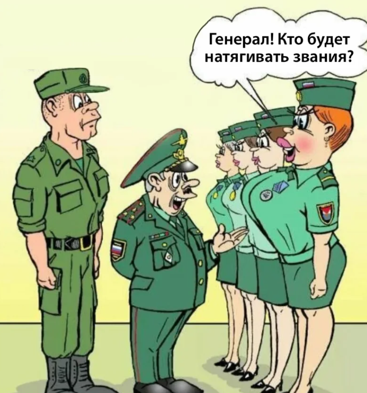 Анекдот: в армию набирают женский состав, вдруг одна девушка спрашивает "Генерал будет натягивать звания, или прапор тоже?"